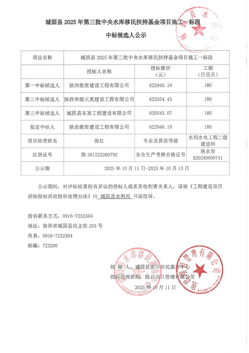 城固县2025年第三批中央水库移民扶持基金项目施工一标段中标候选人公示
