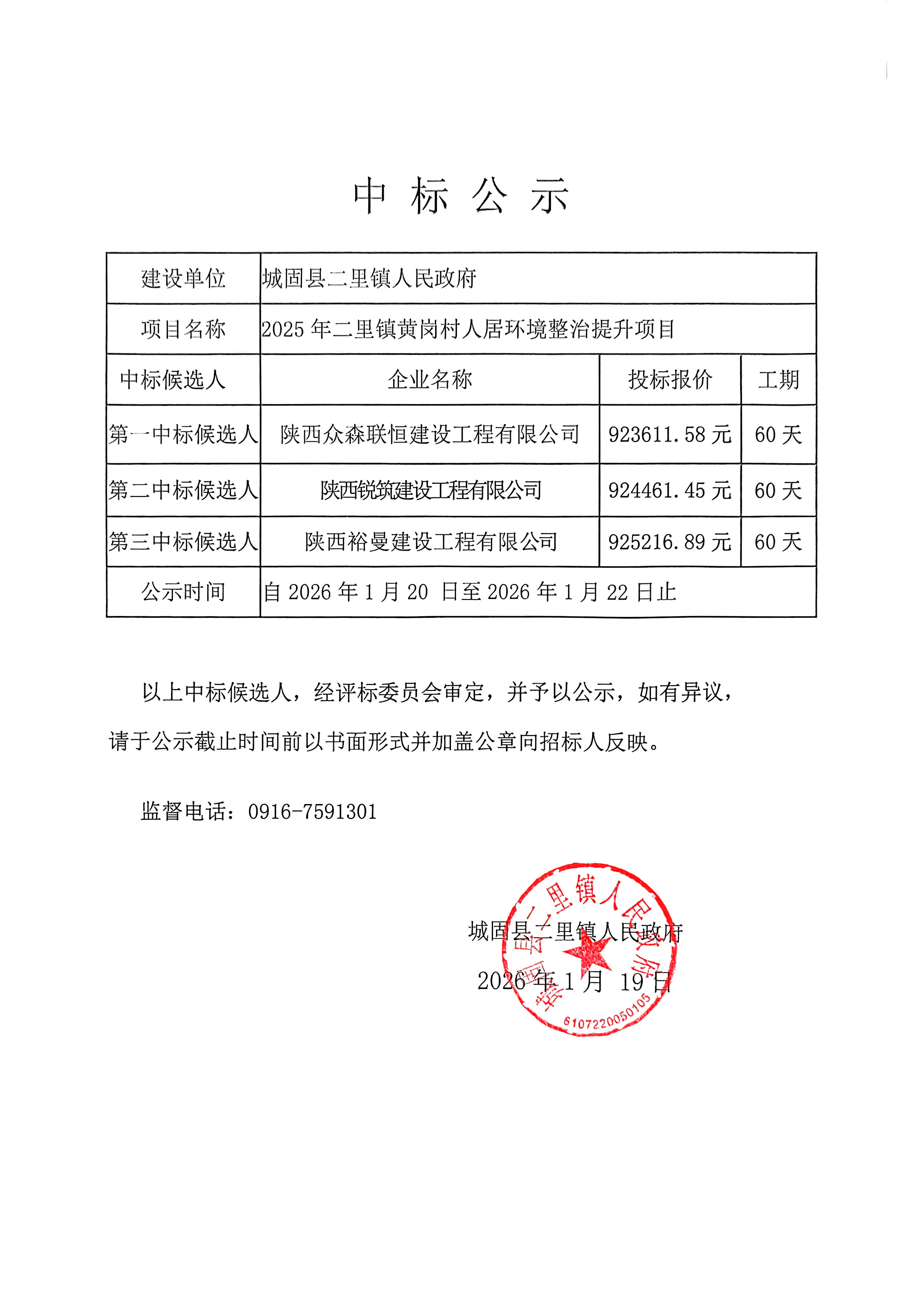 2025年二里镇黄岗村人居环境政治提升项目中标结果公示