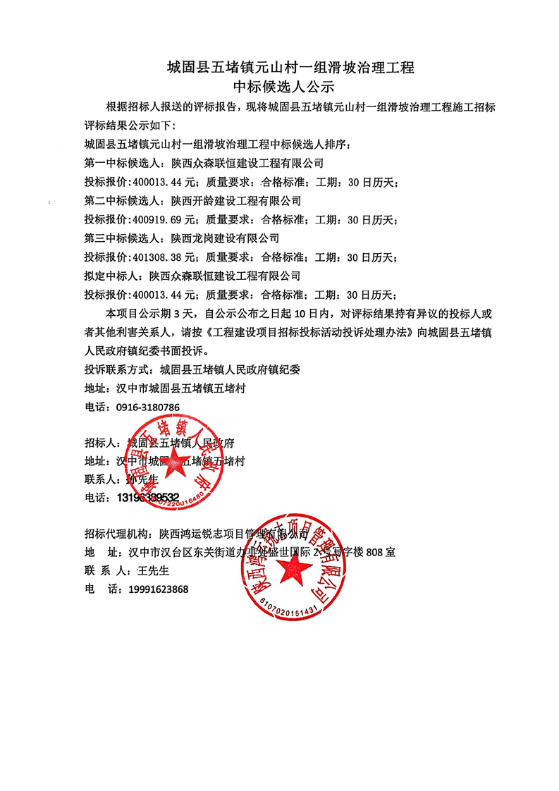 城固县五堵镇元山村一组滑坡治理工程中标候选人公示