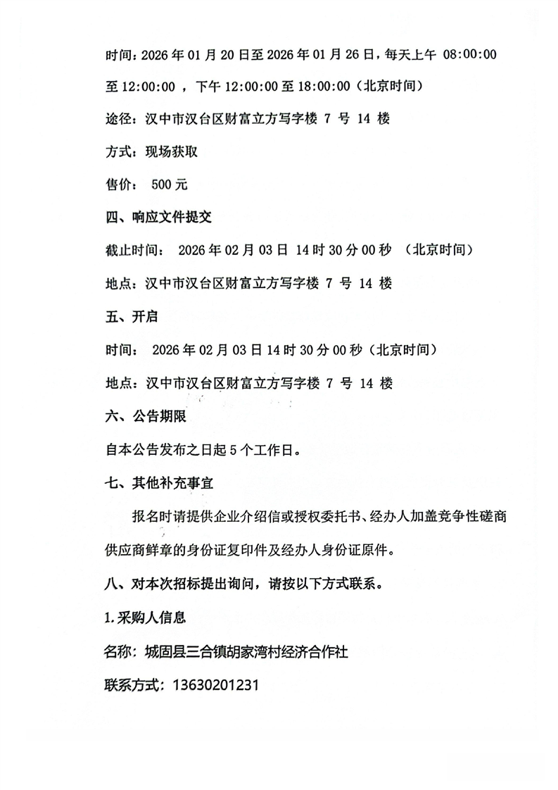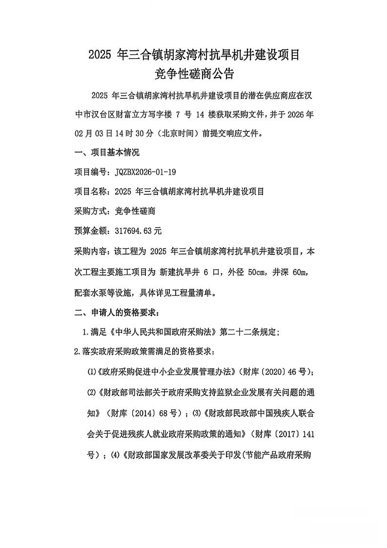 2025年三合镇胡家湾村抗旱机井建设项目竞争性磋商公告