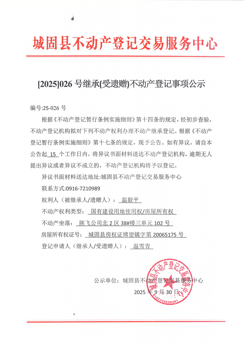 城固县不动产登记交易服务中心继承(受遗赠)不动产登记事项公示(026号)