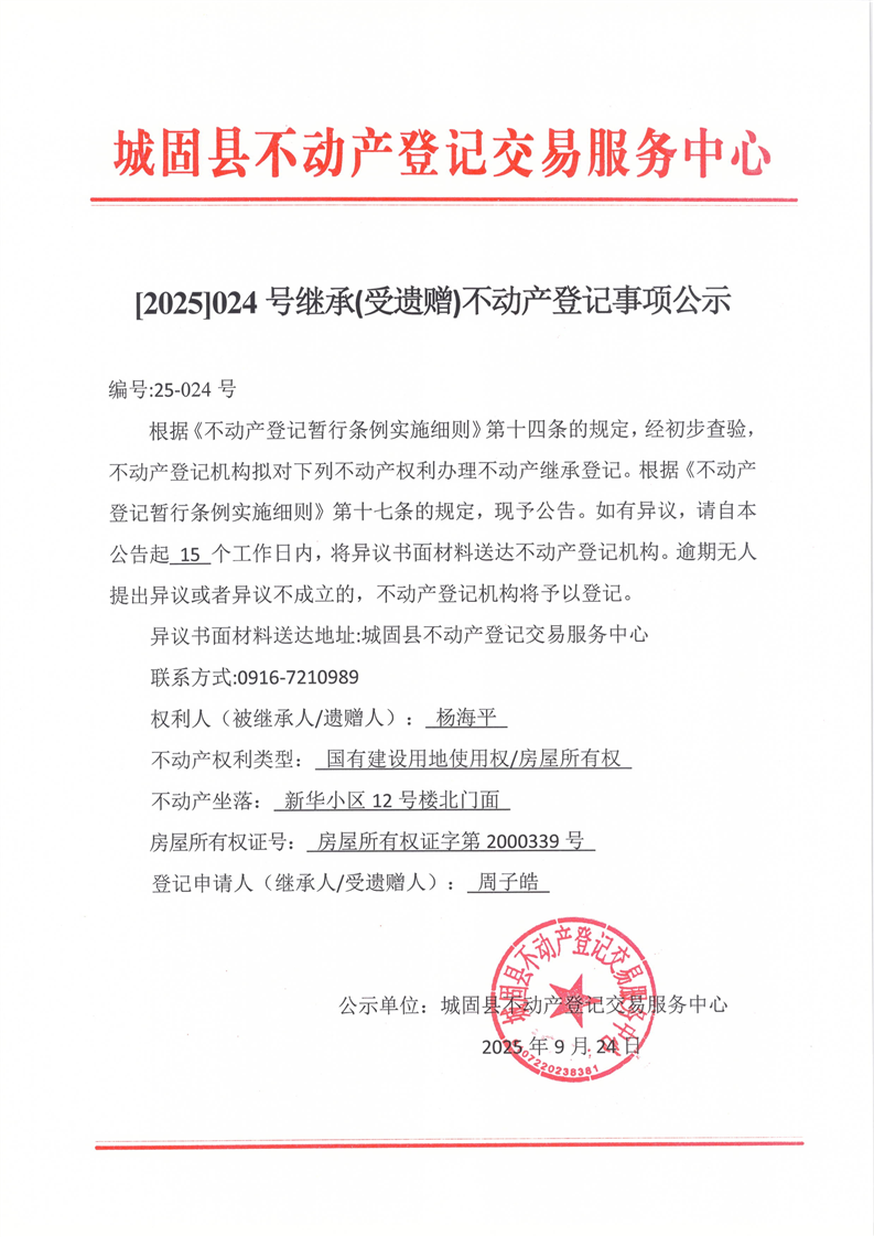 城固县不动产登记交易服务中心继承(受遗赠)不动产登记事项公示(024号)