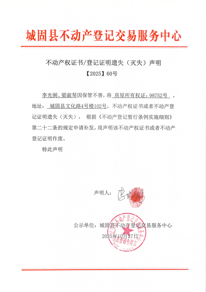 城固县不动产登记交易服务中心遗失(灭失)声明 【2025】60号