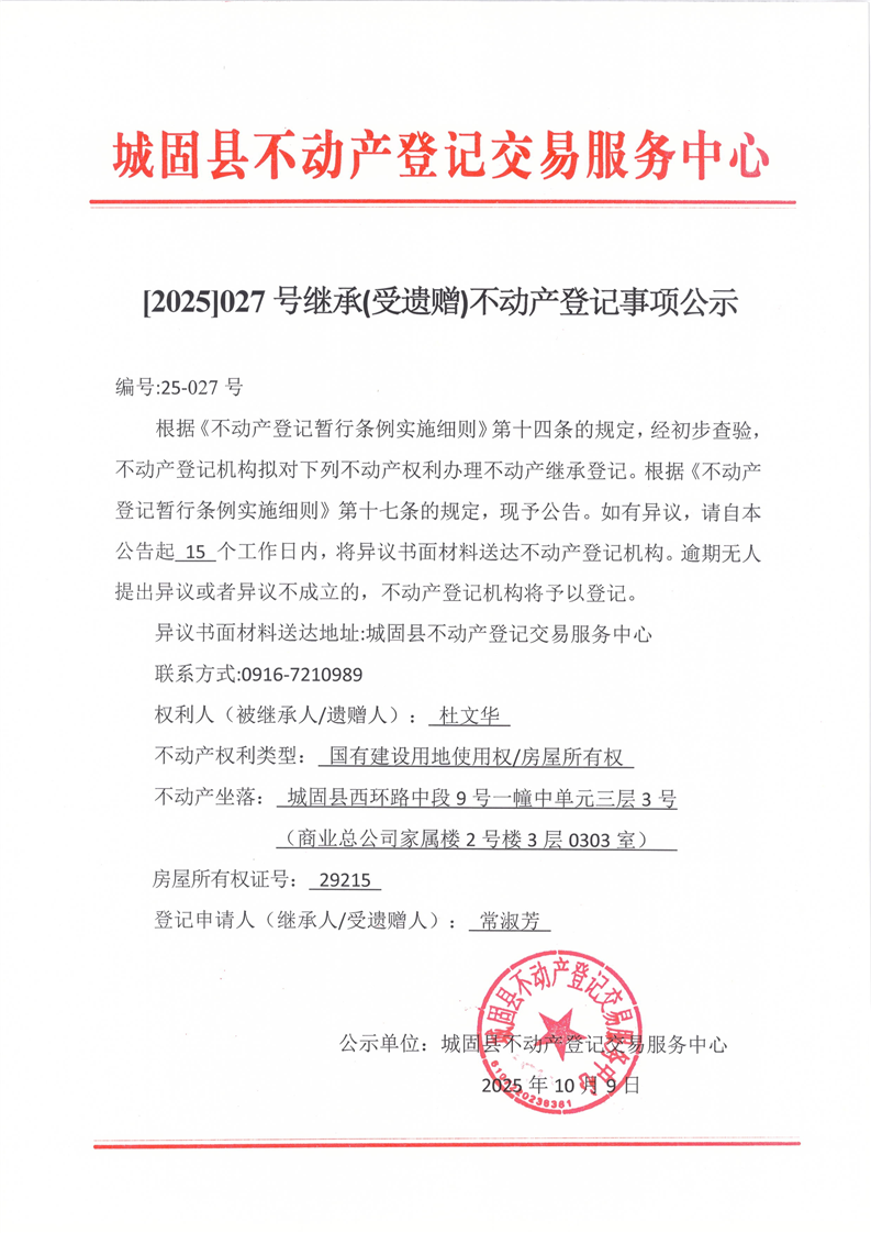 城固县不动产登记交易服务中心继承(受遗赠)不动产登记事项公示(027号)