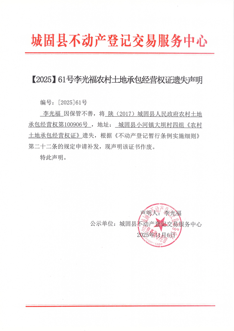 城固县不动产登记交易服务中心遗失(灭失)声明 【2025】61号