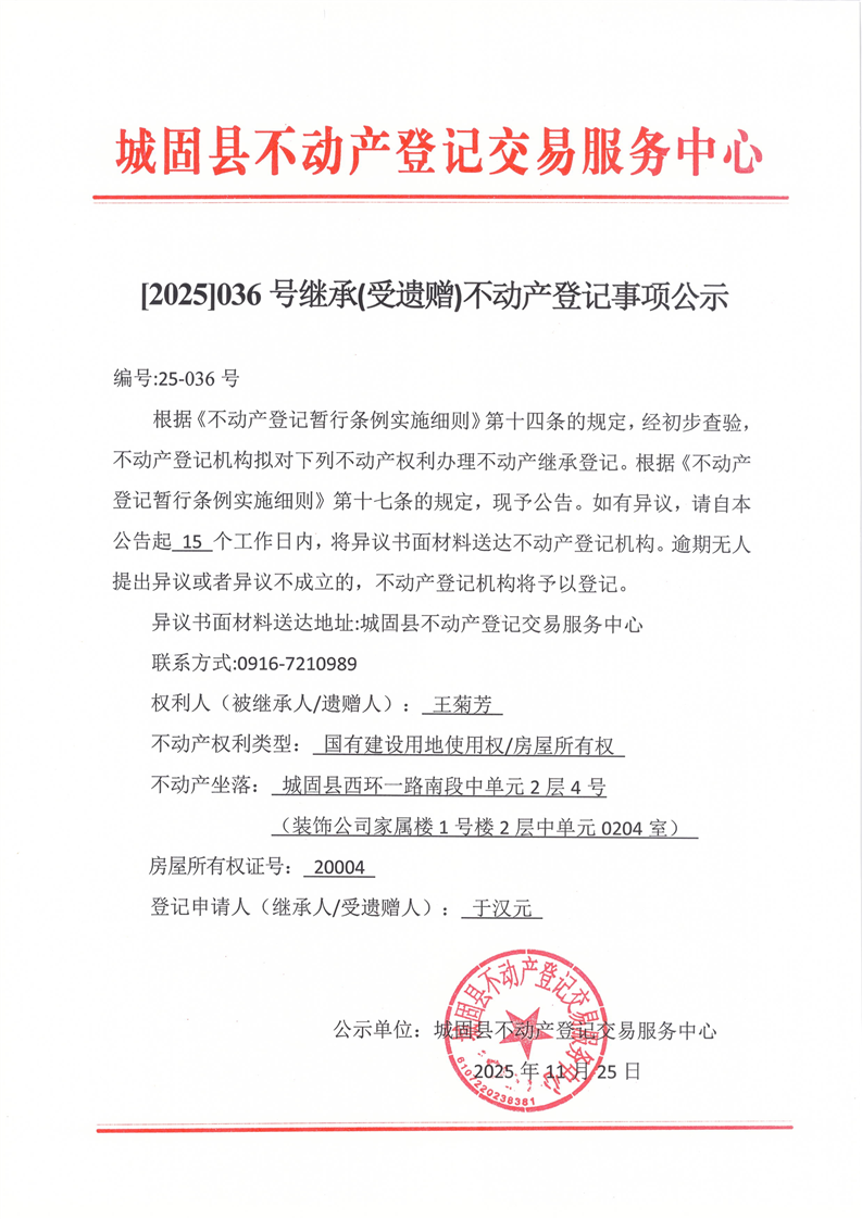 城固县不动产登记交易服务中心继承(受遗赠)不动产登记事项公示(036号)