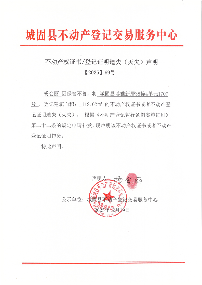 城固县不动产登记交易服务中心遗失(灭失)声明 【2025】69号