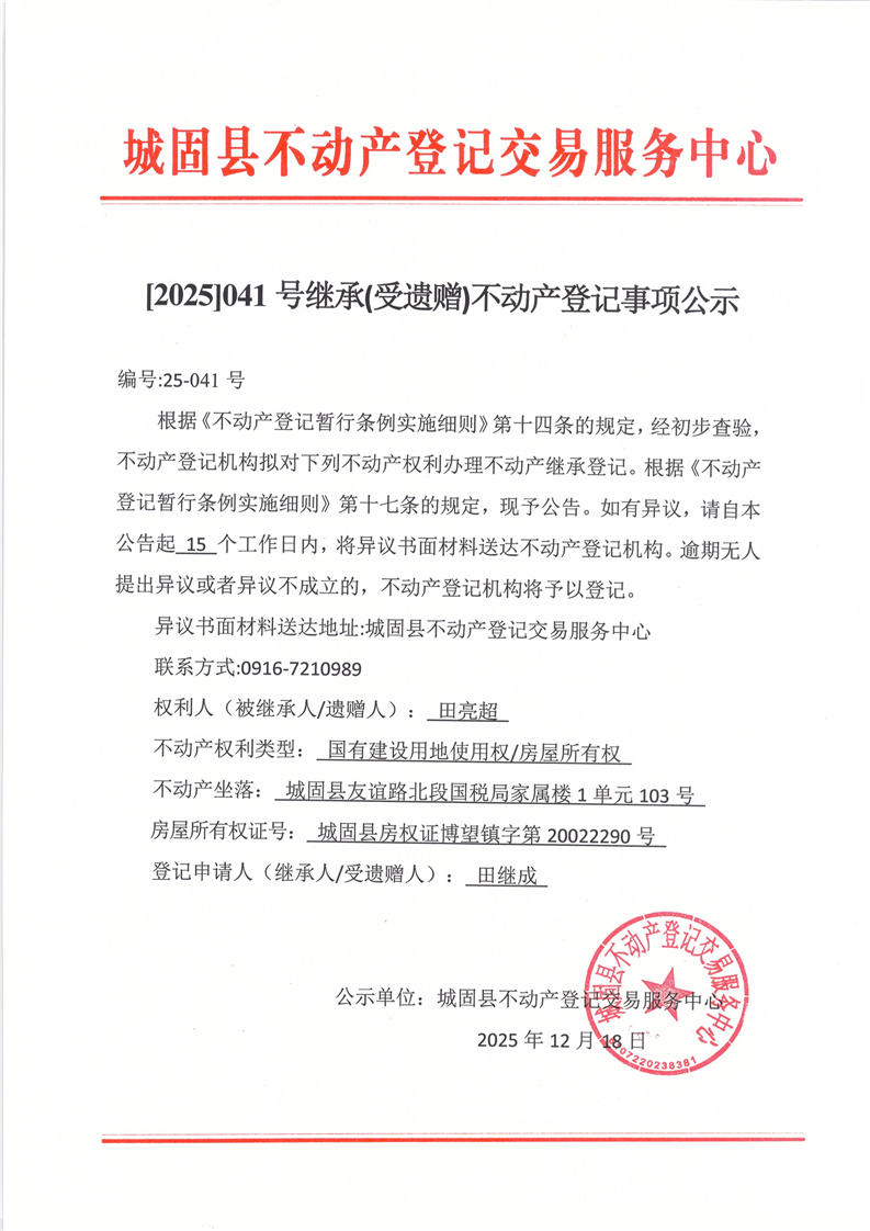 城固县不动产登记交易服务中心继承(受遗赠)不动产登记事项公示(041号)