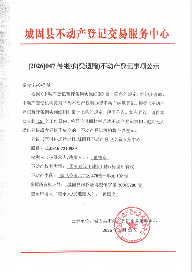 城固县不动产登记交易服务中心继承(受遗赠)不动产登记事项公示(047号)