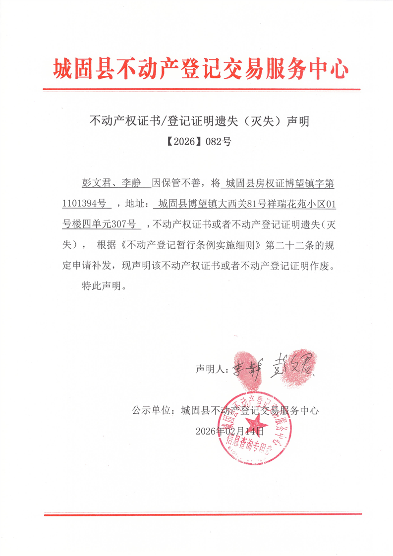 城固县不动产登记交易服务中心遗失(灭失)声明 【2025】82号