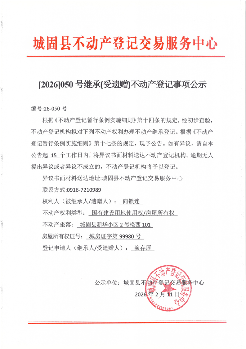 〔2026〕050号继承(受遗赠)不动产登记事项公示