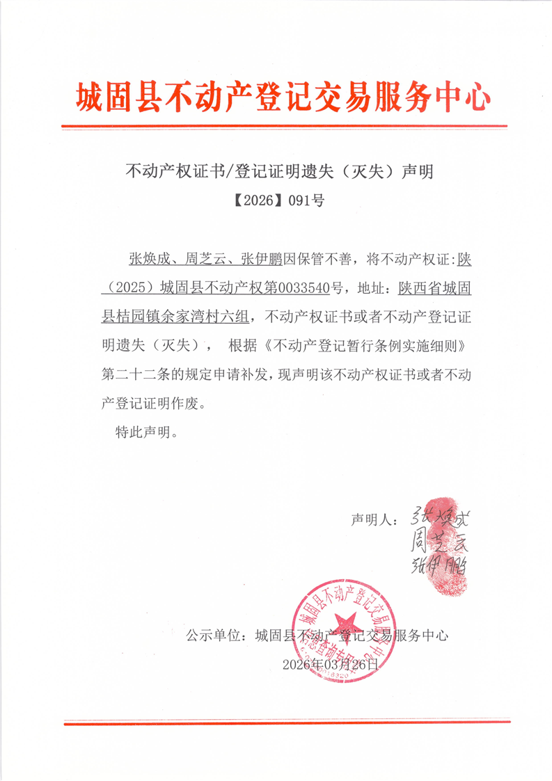 城固县不动产登记交易服务中心遗失(灭失)声明 【2026】91号