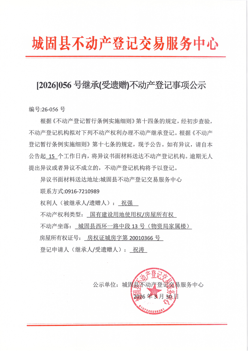【2026】056号继承(受遗赠)不动产登记事项公示