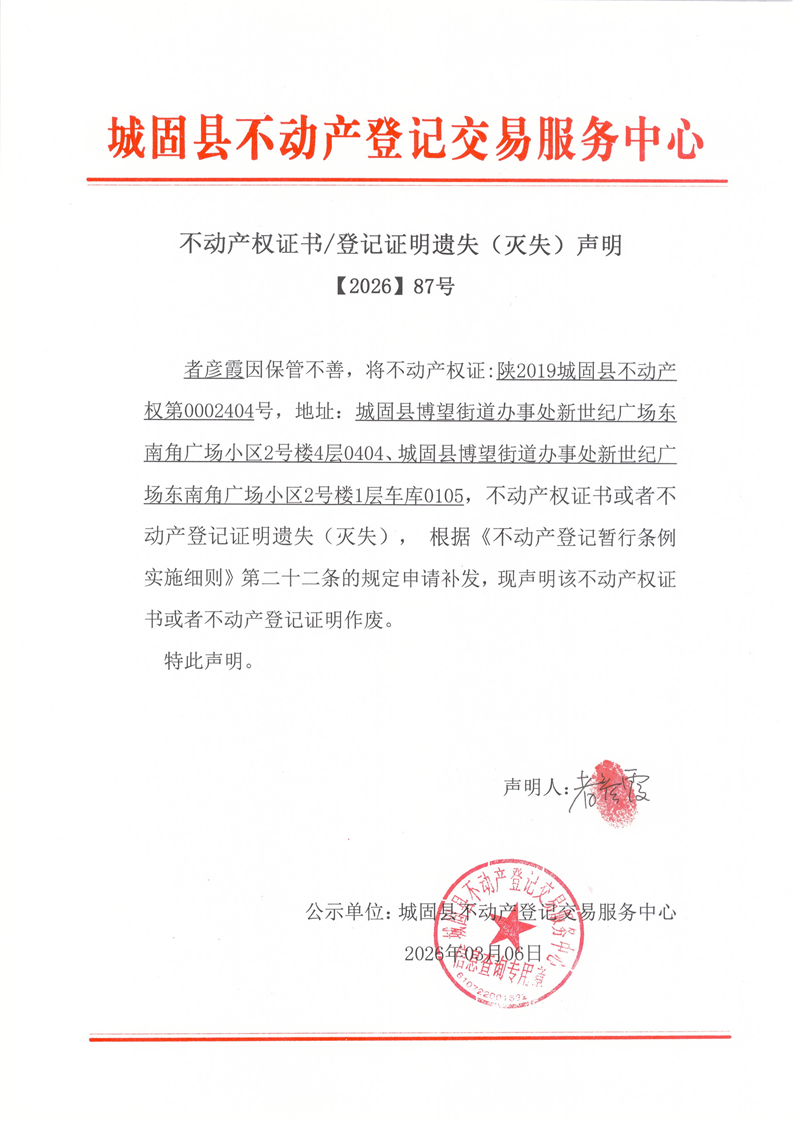 城固县不动产登记交易服务中心遗失(灭失)声明 【2026】87号