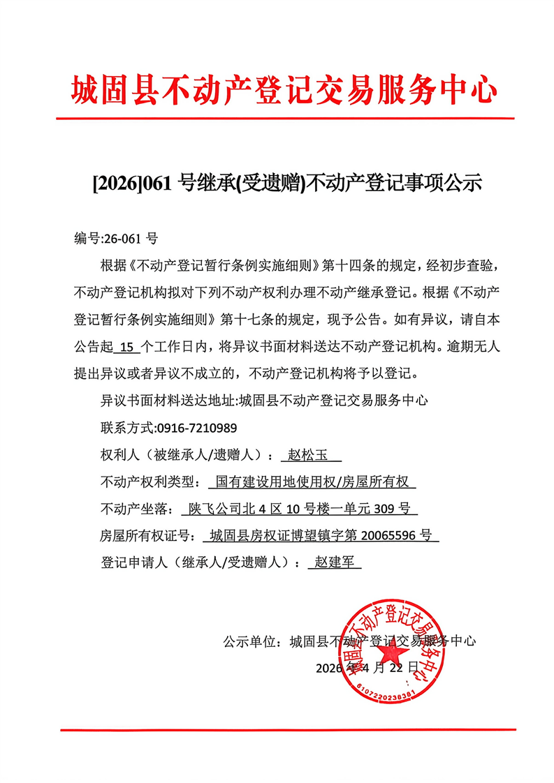 【2026】061号继承(受遗赠)不动产登记事项公示