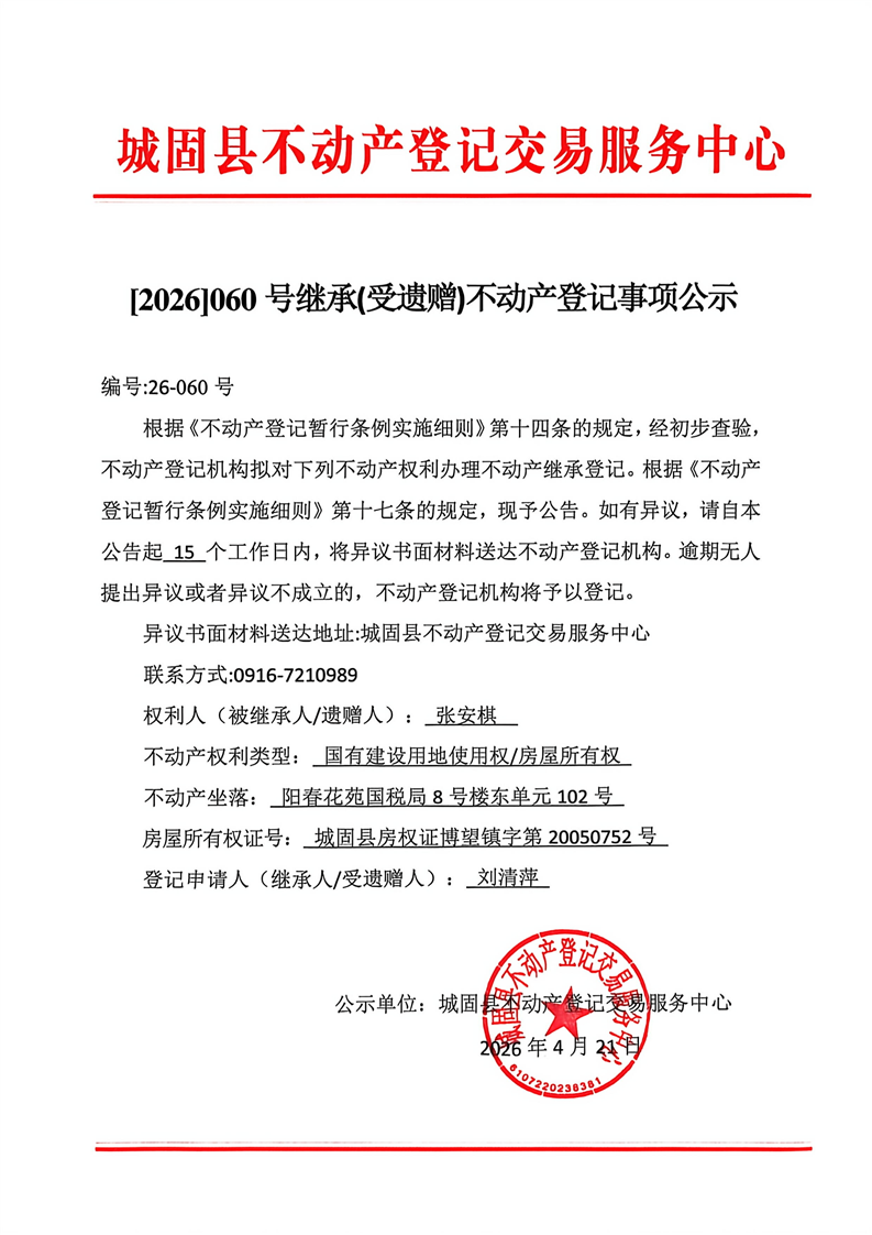 【2026】060号继承(受遗赠)不动产登记事项公示