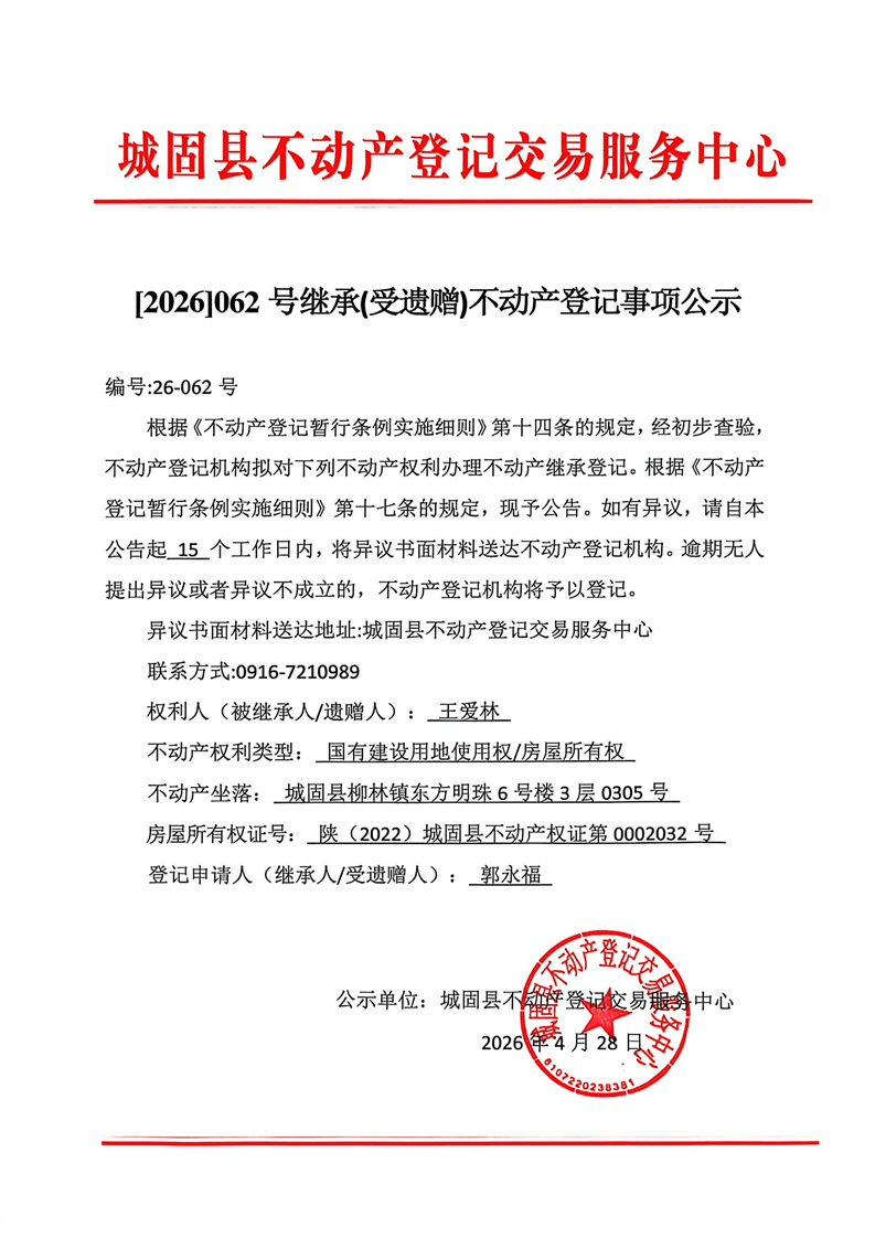 【2026】062号继承(受遗赠)不动产登记事项公示