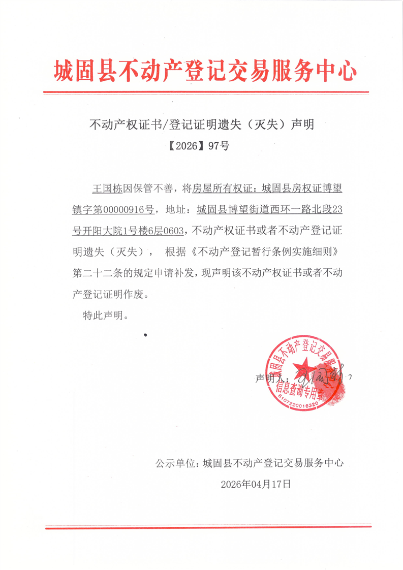 城固县不动产登记交易服务中心遗失(灭失)声明 【2026】97号
